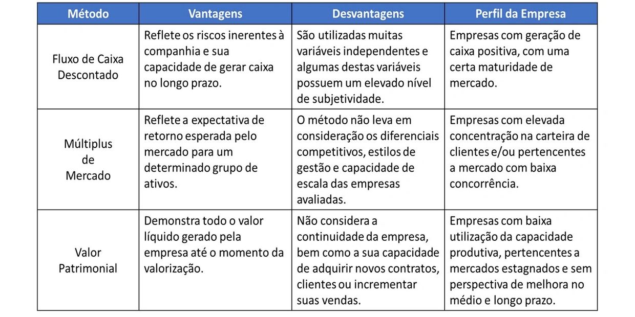 Valor Patrimonial – É uma conta simples, com números que constam em balanço. É a soma de todos os ativos descontadas as dívidas e obrigações financeiras. Vantajoso para empresas com muitos ativos como prédios, máquinas, equipamentos, dinheiro e produtos em estoque, mas sem expectativa de melhora na geração de caixa no longo prazo.